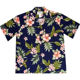 AL-403NC- Coral Plumeria and Hibiscus Navy Cotton Mens Hawaiian