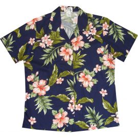 LAL-213NB - Ladies Cotton Camp Aloha Shirt Hibiscus Panel