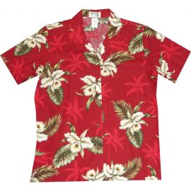 LAL-434 NB- Ladies Cotton Camp Aloha Shirt Orchid Hibiscus Panel