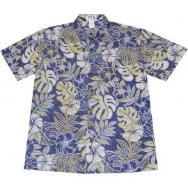 ALS-413W -Orchid Hibiscus Panel Navy Blue Slim Fit Hawaiian Shir