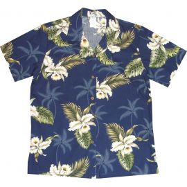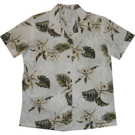 LAL-434 WNB- Ladies Cotton Camp Aloha Shirt Orchid Hibiscus Pane
