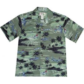 AL-429G- Planes Pearl Harbor Green Aloha Shirt