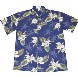 ALS-413W -Orchid Hibiscus Panel Navy Blue Slim Fit Hawaiian Shir