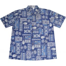 ALS-378 BL- Block Honu Tapa Navy Cotton Slim Fit Hawaiian Shirt