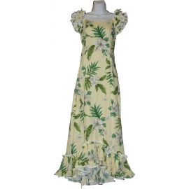 9LM-449G - Yellow Hibiscus Green Traditional Muumuu Dress