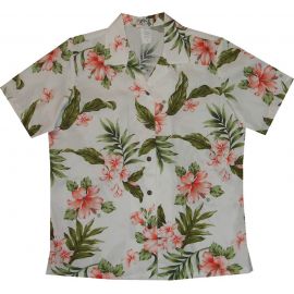 LAL-403WC - Ladies Cotton Camp Aloha Shirt Coral Hibiscus